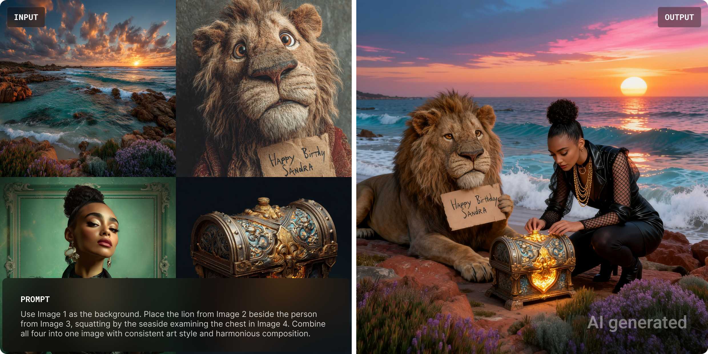 可将文本与最多 10 张参考图片相结合,实现多图融合,进而生成连贯的图像系列,适用于产品故事讲述与营销场景。